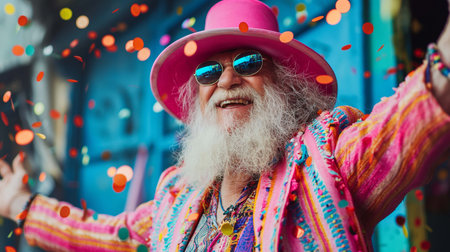 Sunglasses grandpa dressed in festive outfit with arms outstretched portrait image, ai generated. Old man wide smile picture photorealistic photography. Joyful moment concept photo realistic