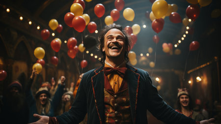 Ultra-realistic circus clown with dramatic expression and vivid colors in festive setting