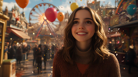 Generative AI Image of Russian Girl Smiling in Carnival with Ferris Wheel and Confetti