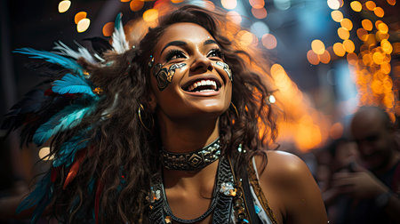 A radiant carnival queen with a feathered headdress and joyous expression amidst a festive backdrop