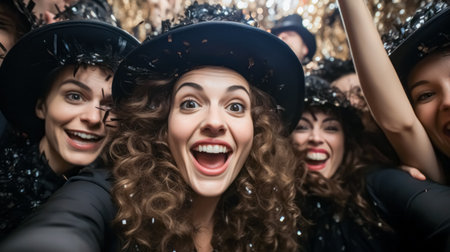 cheerful young women in carnival costumes taking selfie on smartphone. Beautiful women in black hats looking at camera and laughing at party.