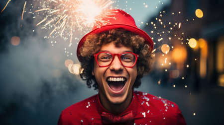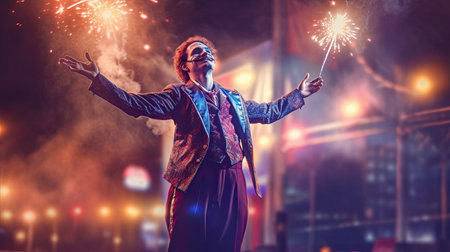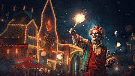 Night street circus performance whit clown, juggler. Festival city background. fireworks and Celebration atmosphere.