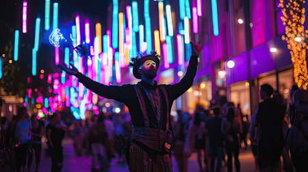 A street performer entertains crowds at Vivid Sydney, surrounded by neon lights and interactive art installations that fill the night with a magical atmosphere