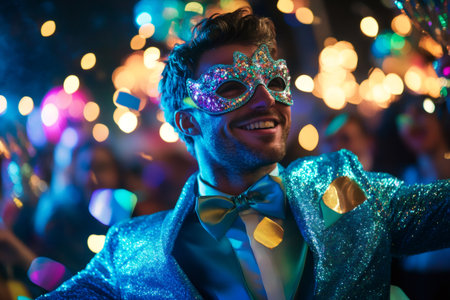 Young man wearing elegant sparkly blue suit and mask, smiling and enjoying a vibrant nightlife party