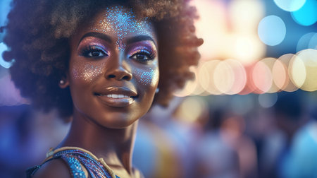 An AI-generated illustration of A young woman stands looking confidently into the camera with glitter paint highlighting her facial features