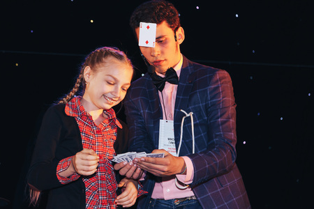 MINSK, BELARUS November 4 2017 International Illusion Festival MAGIC 2017 A young magician shows the performance on stage