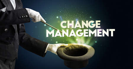 Illusionist is showing magic trick with CHANGE MANAGEMENT inscription, new business model concept