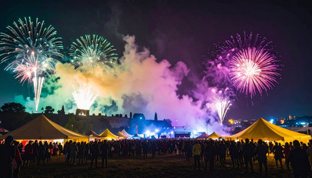 Colorful fireworks burst above a lively crowd at a nighttime festival, creating an electric atmosphere filled with energy and excitement as people enjoy the festivities.