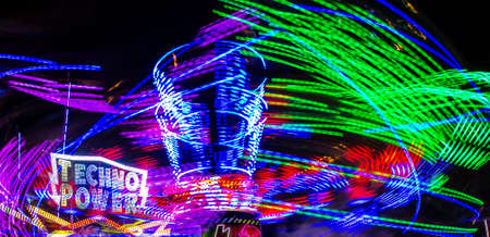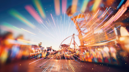 Colorful ferris wheel illuminated at night. Mesmerizing light trail effect at a lively carnival with vibrant attractions