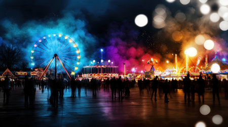Blurred bokeh effect at vibrant carnival scene with illuminated rides, games, and food stalls