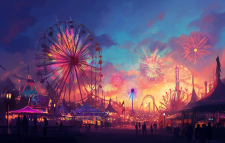 A summer carnival scene with a Ferris wheel, colorful lights, and people enjoying fun rides at twilight.