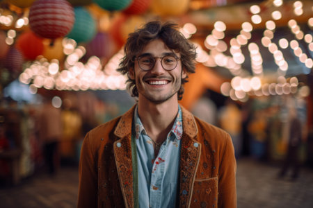 Generative AI Image of Back View of Man in Carnival with Ferris Wheel and Confetti at Night