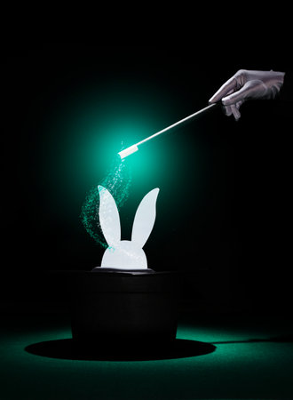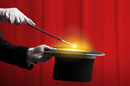 A magician in white gloves waving a wand over a top hat filled with glowing light blue stars