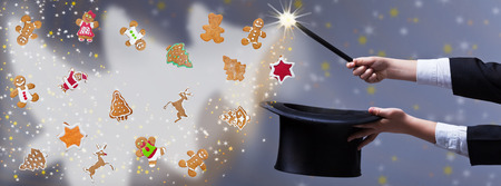 Christmas magic with gingerbread cookies, magician hands holding black hat and wand