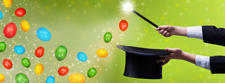 Easter magic for copy space - magician hands with black hat and wand