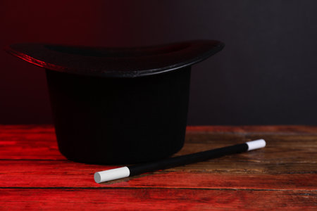 Magician's hat and wand on wooden table against dark background
