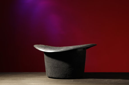 Magician hat with smoke floating on wood stage.