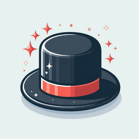 Illustration of a black top hat with red ribbon and stars.