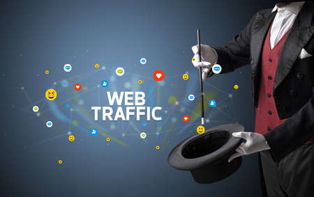Magician is showing magic trick with WEB TRAFFIC inscription, social media marketing concept