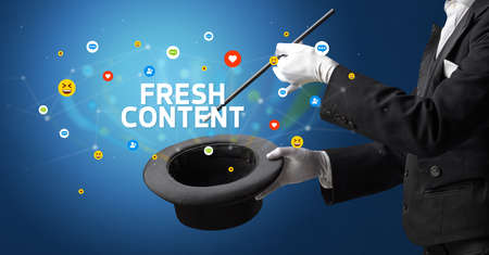 Magician is showing magic trick with FRESH CONTENT inscription, social media marketing concept