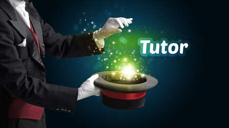 Magician is showing magic trick with Tutor inscription, educational concept