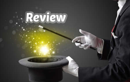 Magician is showing magic trick with Review inscription, educational concept