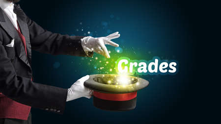 Magician is showing magic trick with Grades inscription, educational concept