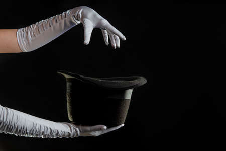 Hand gestures. Showman shows disappearing tricks in a hat, white gloves and black top hat,
