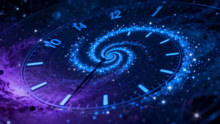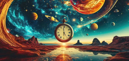 Surreal fantasy scene of a giant golden clock face emerging from swirling cosmic energies, symbolizing the concept of time and space manipulation.