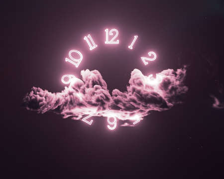 A surreal concept of a bright glowing neon clock numbers in a fluffy dark cloud on a stellar space background - 3D render
