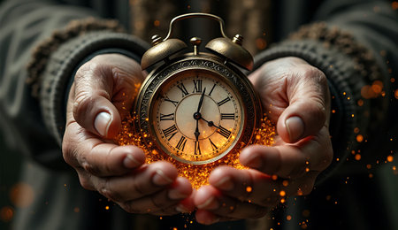 A person carefully holds a gold, antique clock with golden sparks illuminating the hands and dial.