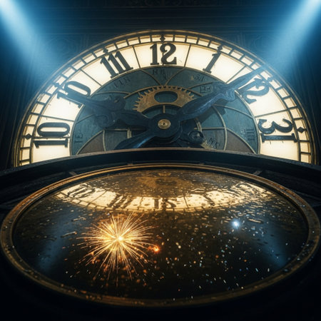 Elegant New Year clock showing with golden fireworks lighting up the background, styled for celebrations.