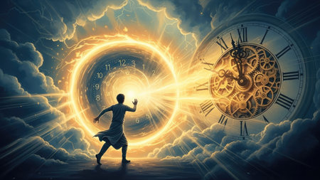 An illustration depicts a silhouetted figure reaching toward a glowing portal, with a detailed clock in the background. The artwork features vibrant gold and blue hues, a dynamic composition, and dramatic lighting. This image could be used for various projects related to time, science fiction, or fantasy themes.
