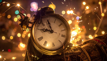 New Year's Eve. Old clock on a background of bokeh lights