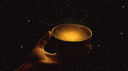 Hand holds golden cosmic cup in starry night sky