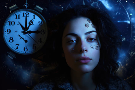 A waking woman against the background of clock dials in blue light. Concept of circadian rhythms, time management, deadline