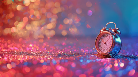 Silver alarm clock on glittery, colorful sparkling background
