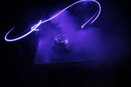 Calling service bell on wooden table with toned lights on dark background. Hotel reception bell, service bell on the table, selective focus