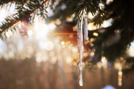 Icicles dripping with warm sunlight and a soft bokeh background, capturing the essence of winter.
