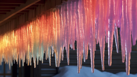 An icicles hanging from snow, reflecting colorful lights in background, create magical winter scene. vibrant hues add festive touch to icy formations, evoking sense of wonder