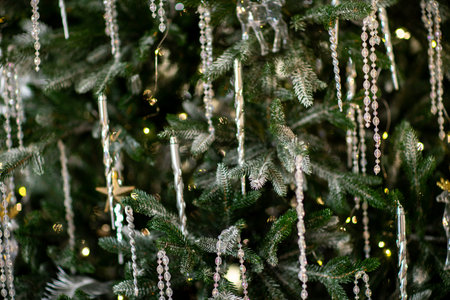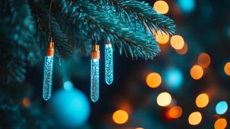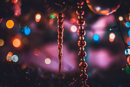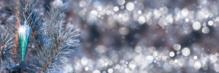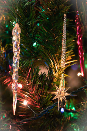 Glass icicle christmas ornaments hanging on snowy fir tree branch with warm bokeh lights. Magical winter holiday decoration.
