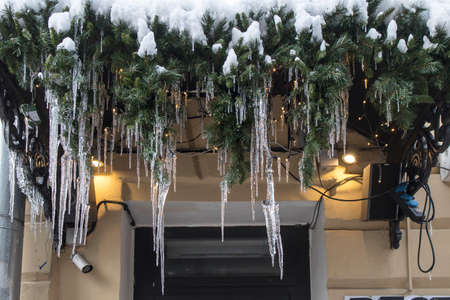 Green branches of fir with cones and toys, icicles hang above the entrance to the door