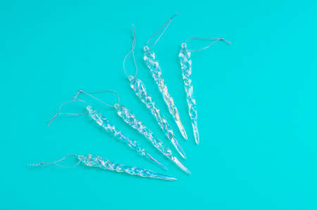 Glass icicles for decorating a Christmas tree on a turquoise background. Place for your text.