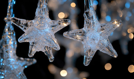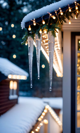 Captivating image of glistening icicles hanging amidst a backdrop of shimmering bokeh lights, evoking the serene beauty of winter's chill and magic.