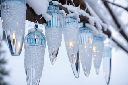 Stunning close-up of crystal ornaments hanging delicately from snow-covered branches, reflecting light and creating a serene winter ambiance perfect for seasonal decor.