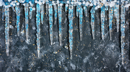 Vivid ice stalactites captured in a row, a spectacle of frozen colors