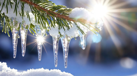 Close-up of a pine branch with snow and icicles sparkling in the sunlight.