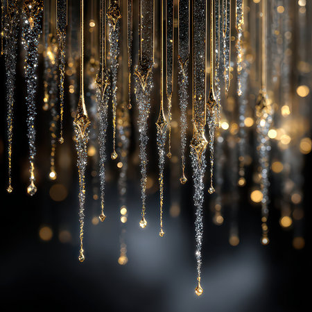 A captivating display of shimmering golden and silver drops creates an enchanting atmosphere, perfect for festive occasions and elegant designs.