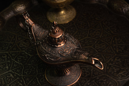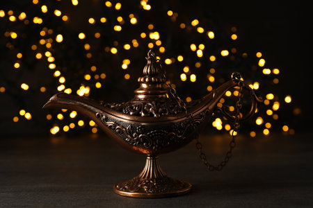 Aladdin Magic Genie Lamp on black wooden background, make a wish concept.