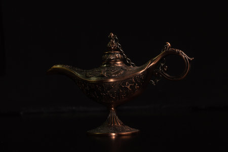 Image of magical mysterious aladdin lamp over black background. Lamp of wishes